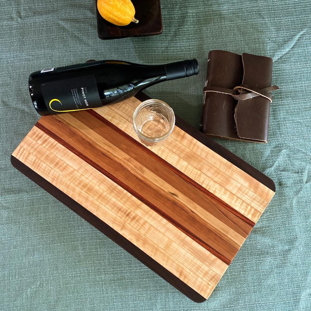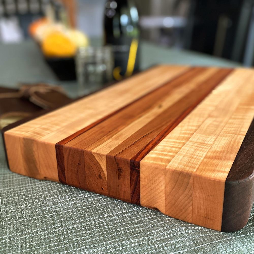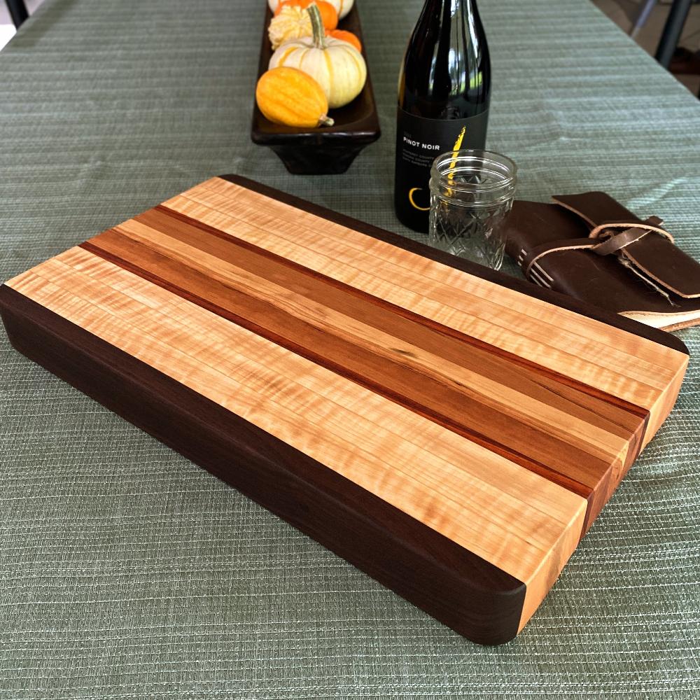 The Edge Grain Serving Board is a 17 1/2 x 10 1/2 x 1 7/8 board made of Walnut, Tiger Maple, Padauk and Gummy Cherry. A little extra round over on the bottom of the board along with the board feet make this board easier to present.
