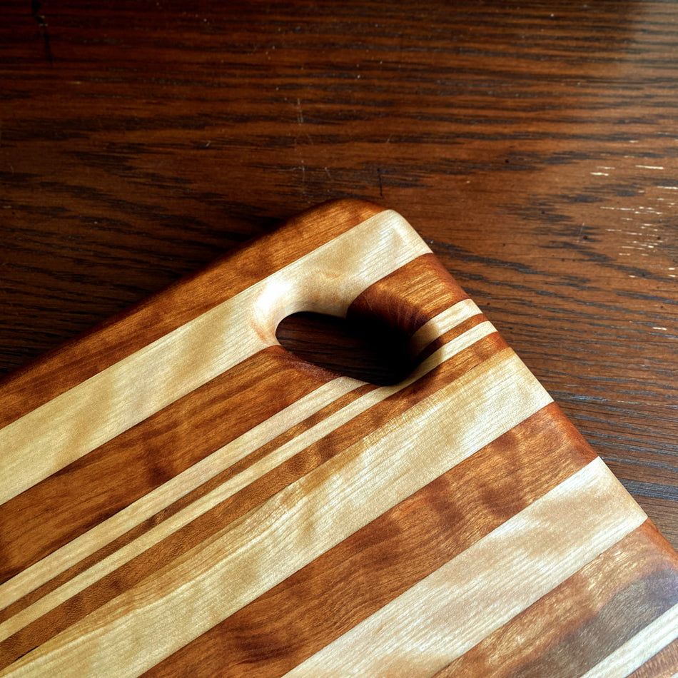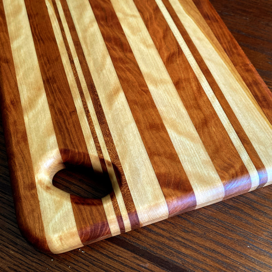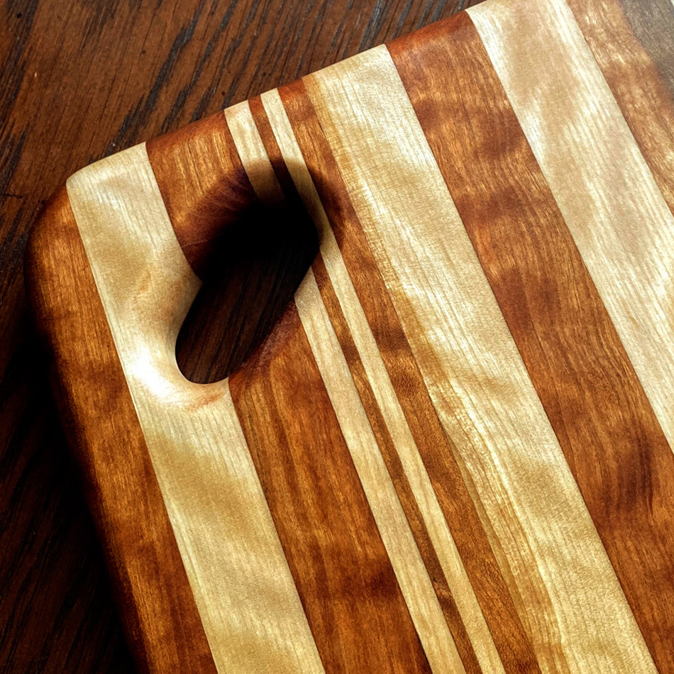 This Charcuterie Board is crafted from Curly Cherry and Tiger Heart. These two wood species are beautiful together. cutting surface. The 17 3/4-inch board delivers ample space to hold meats, cheeses, fruits, and other appetizers, while the 1-inch thickness offers durable rigidity. A Millie's All-Purpose Penetrating Tung Oil finish seals to further reinforce the board's strength and longevity.