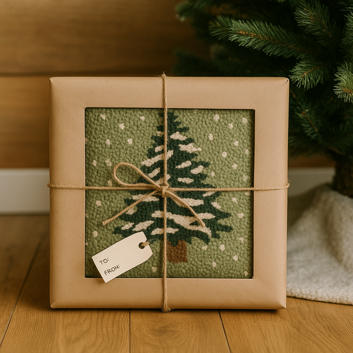 Gift wrapped in brown paper shows a hand hooked pillow featuring a Christmas tree design, placed against a wooden floor.