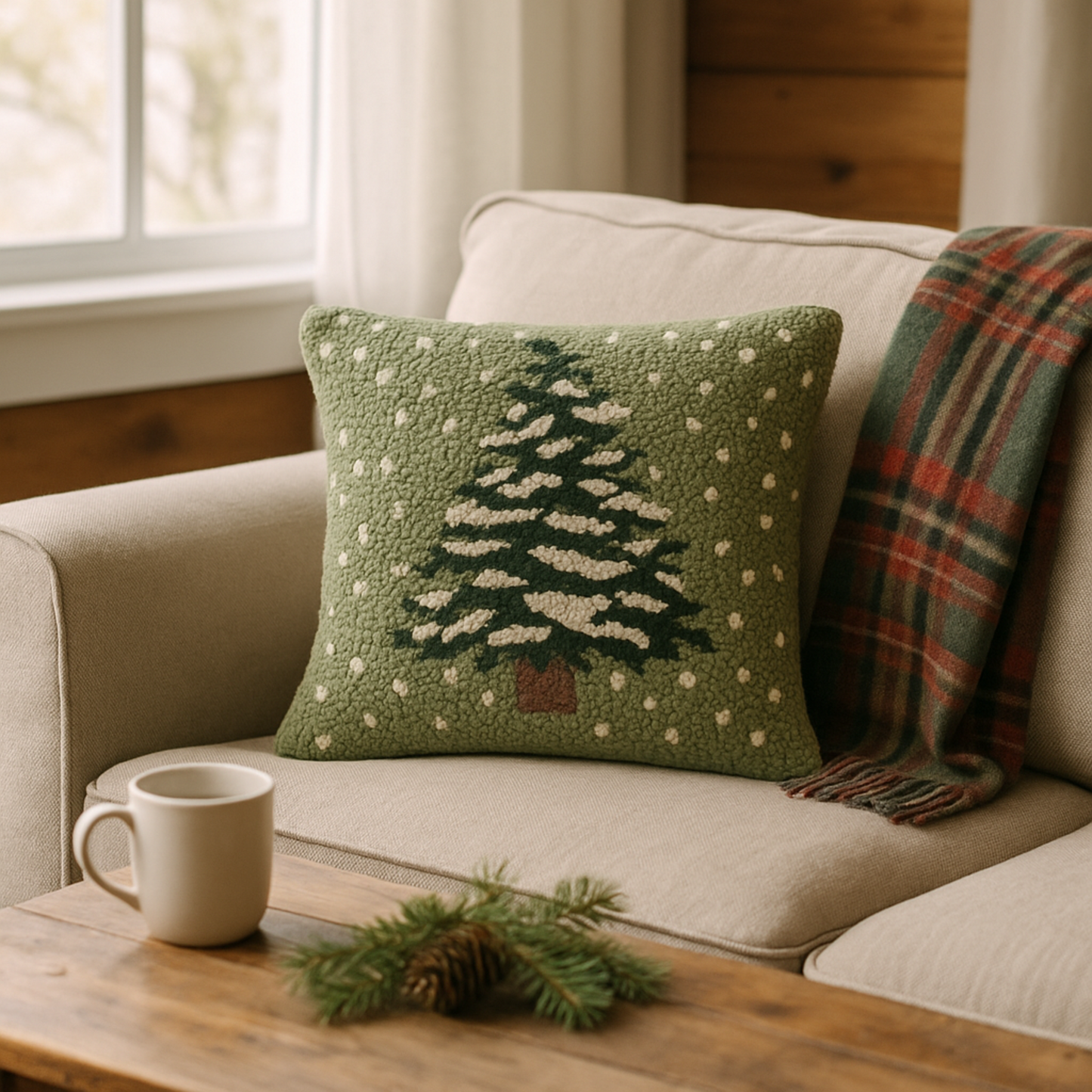 Green hand hooked pillow with a Christmas tree design on a beige sofa with a plaid blanket.