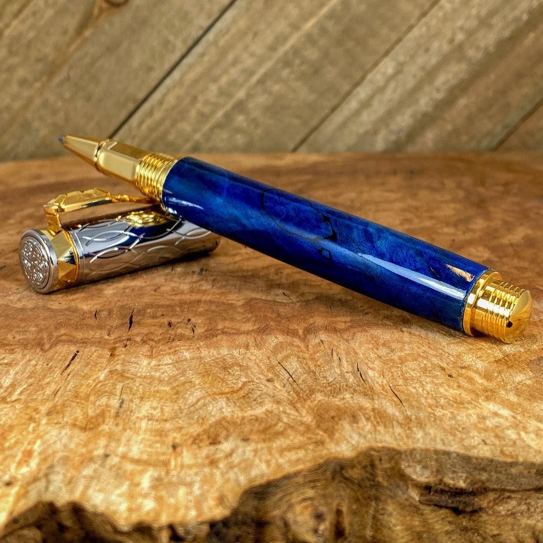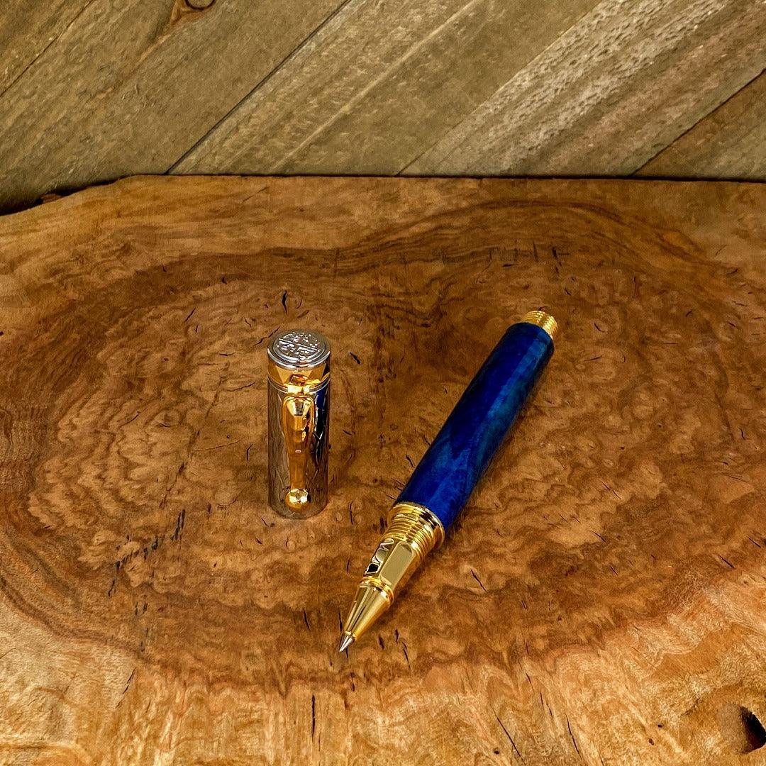 Our pen is crafted with box elder burl, dyed blue and photographed with our Messenger Leather Journal.