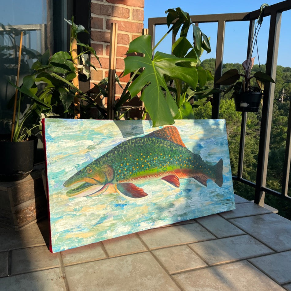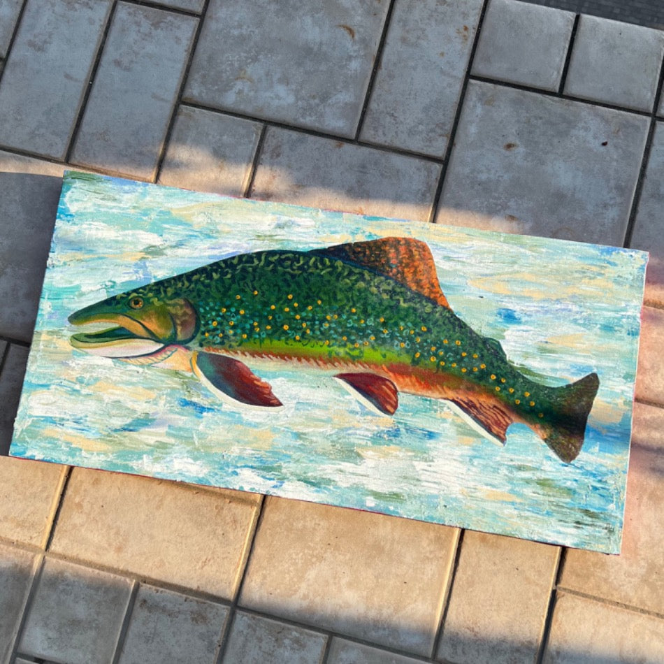 Art Bio: The Brook Trout. This work combines textures and techniques of acrylic painting to create a trout enveloped in an abstracted water space. The use of glazing creates a glow within the colors of the brook trout. All together the colors and techniques in this piece display the natural beauty of the brook trout.